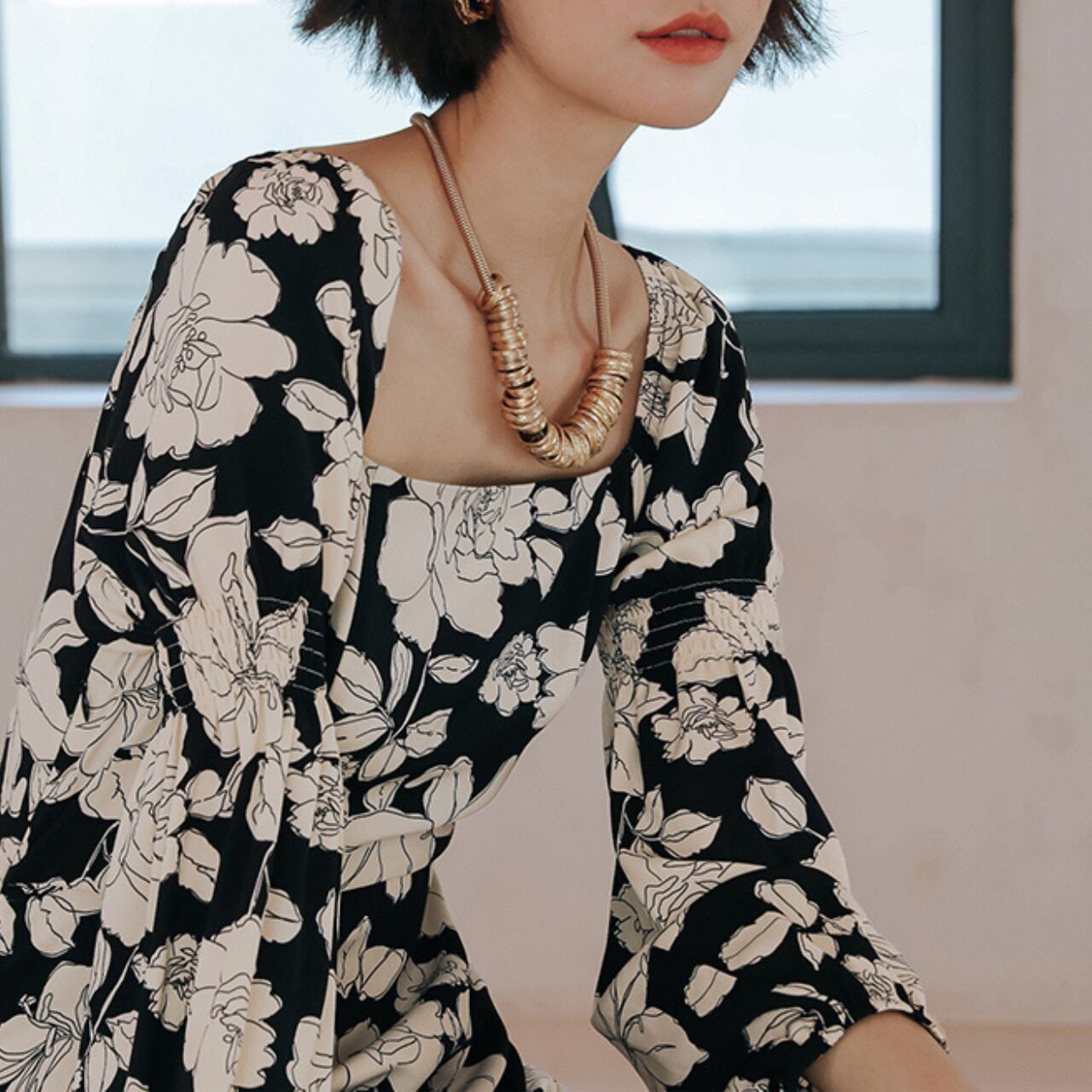 華やかな花柄が女性らしさを引き立てる一枚。優美なデザインと柔らかなシフォン素材が、どんなシーンでもあなたを華やかに演出します。