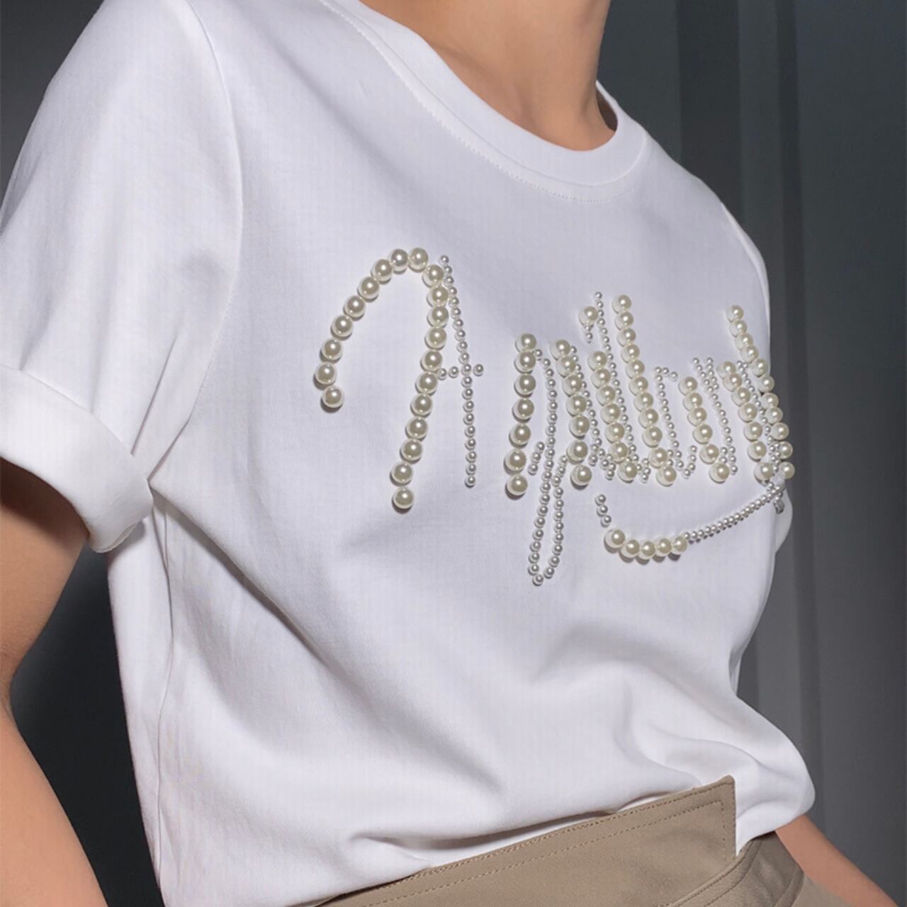 シンプルなデザインにパールロゴが上品なアクセントを添えた一枚。カジュアルながらもエレガントな雰囲気を演出し、どんなスタイルにもマッチするアイテムです。