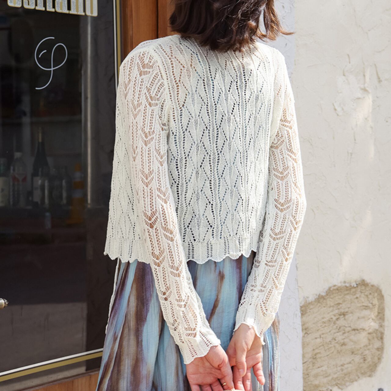 涼やかさを演出するホワイトサマーニットカーディガン。清涼感漂うホワイトカラーで、夏の装いをさりげなく引き立てます。繊細な編み模様が加えられたデザインは、軽やかで女性らしい印象を与えます。