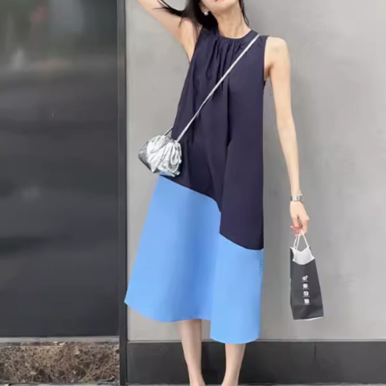 オシャレなツートーンデザインが目を惹くノースリーブワンピース。色使いによる遊び心がありながらも、上品で洗練された印象を与える一着です。