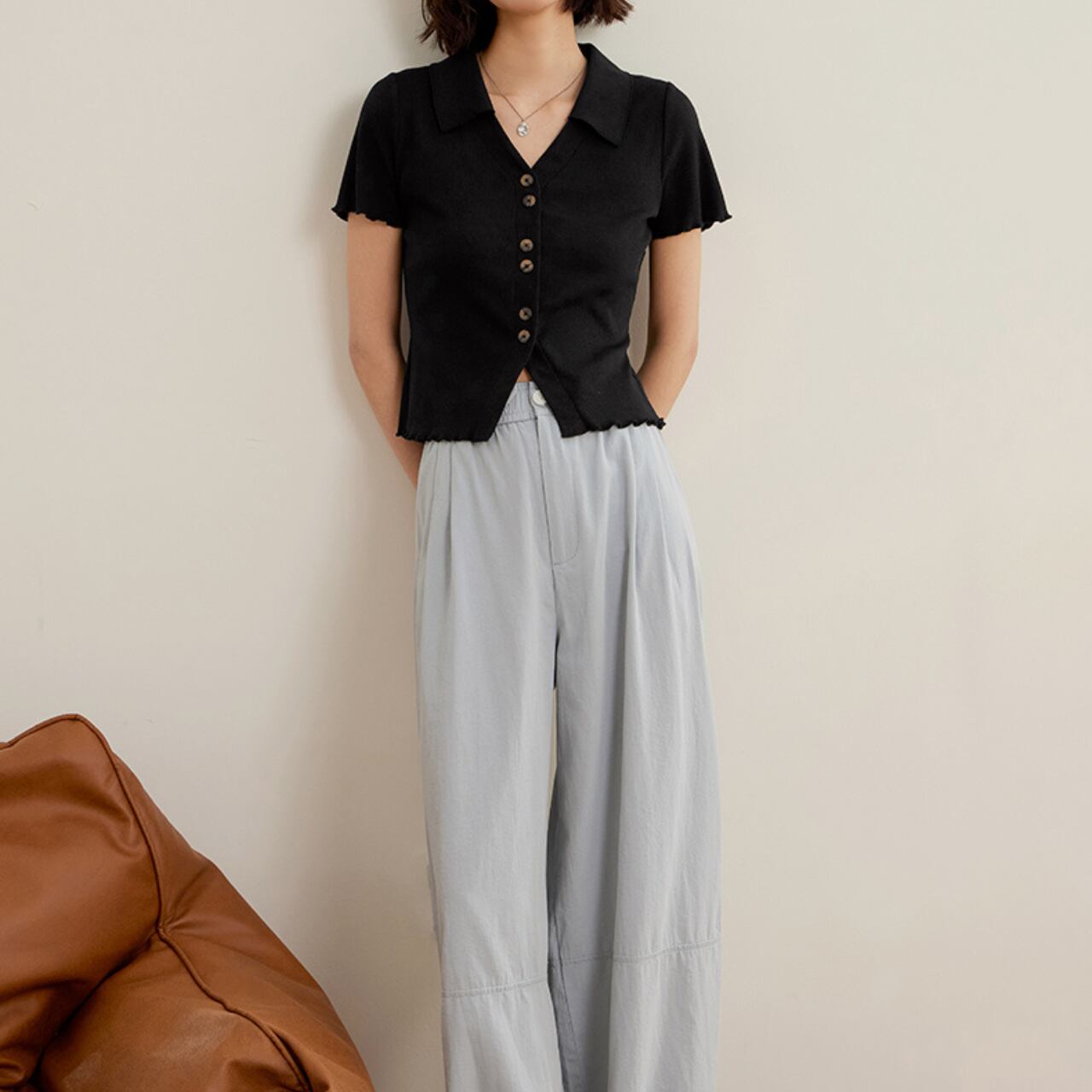 襟付きメロウトップスは、華やかさと女性らしさを兼ね備えた1枚です。上品な襟元が大人っぽい印象を演出し、裾に向かって広がるメロウシルエットが女性らしい柔らかさをプラスしています。