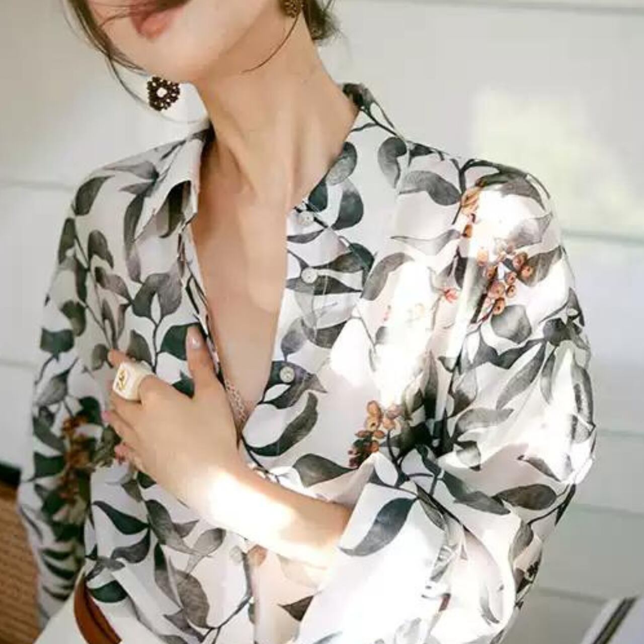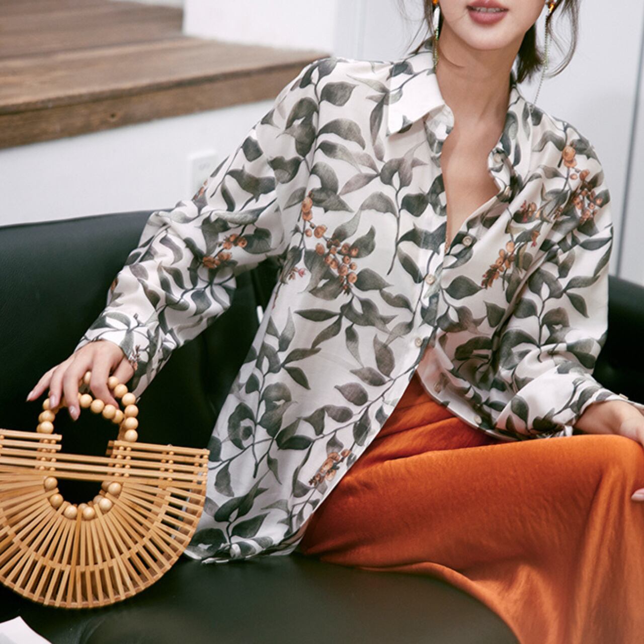 華やかなデザインが目を引く一枚です。ザクロのプリントが施されたシャツは、存在感のあるアイテムとしておしゃれを楽しみたい方におすすめです。